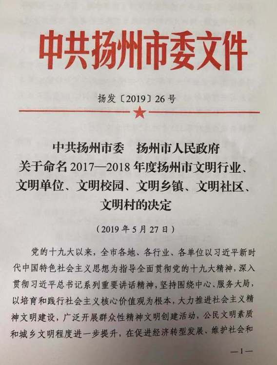 公司再获“扬州市文明单位”称号
