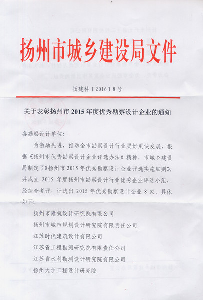 公司获扬州市2015年度优秀勘察设计企业...