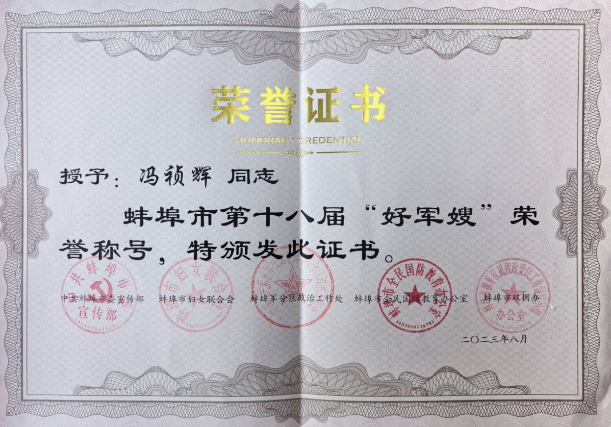 公司冯祯辉同志获得蚌埠市第十八届“好军嫂...