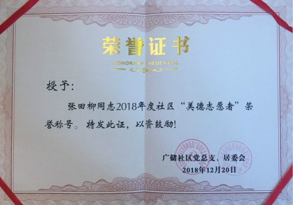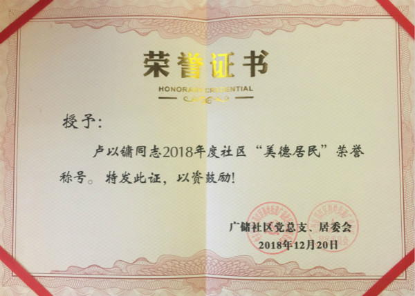 日,公司被扬州市广储社区党总支、居委会授予“党建共建共联美德单位”荣誉称号,这是公司党建结对共建获得的又一硕果。同时公司退休职工卢以镛和张田柳分别被授予“美德居民“和”美德志愿者“称号。